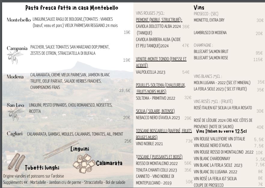 Les pâtes fraîches sont notre spécialité. Elles sont au menu tous les jours avec de produits frais de saison. Vous pouvez aussi tout acheter à emporter.